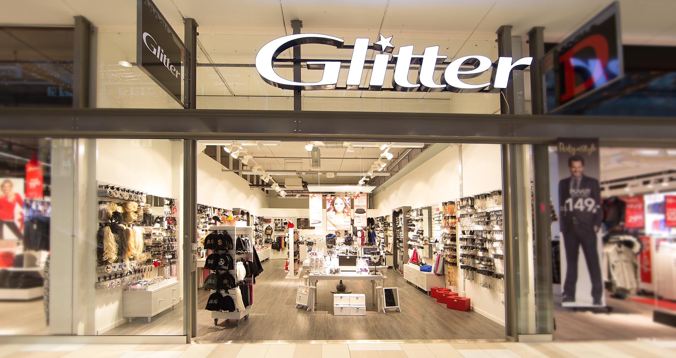 Glitterin myymälästä löydät laajan valikoiman aitoa hopeaa olevia koruja, pukukoruja, laukkuja ja hiusasusteita, jotka sopivat mihin tahansa tilanteeseen. Glitterin asiantunteva henkilökunta tarjoaa inspiraatiota sekä vinkkejä, jotta löydät etsimäsi. Glitterin valikoimaa täydennetään joka viikko jännittävillä uutuuksilla ja trendeillä. Toivotamme sinut lämpimästi tervetulleeksi myymäläämme tutustumaan laajaan valikoimaamme, joka sisältää klassisia ja uusinta trendiä olevia korvakoruja, sormuksia, kaulakoruja, laukkuja, hiusasusteita ja paljon muuta.