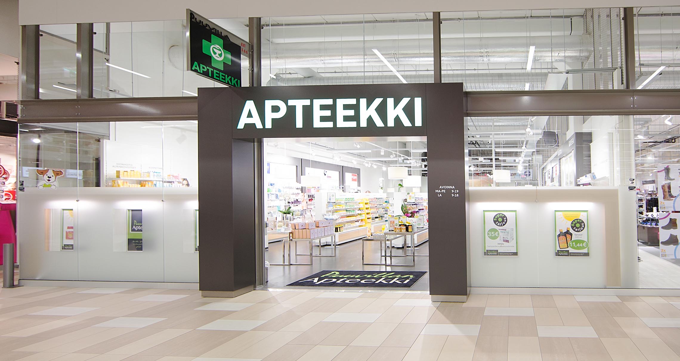 Puuvillan Apteekki palvelee lääkkeisiin, terveyteen ja hyvinvointiin liittyvissä asioissa kauppakeskuksen ensimmäisessä kerroksessa.